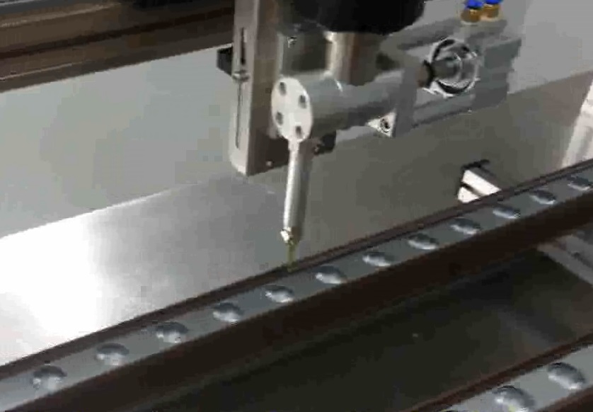 Put the work-piece on the moving platform by the designed fixture, the working platform and gluing nozzle move as programmed track to coat the work-piece accurately by compressed air.