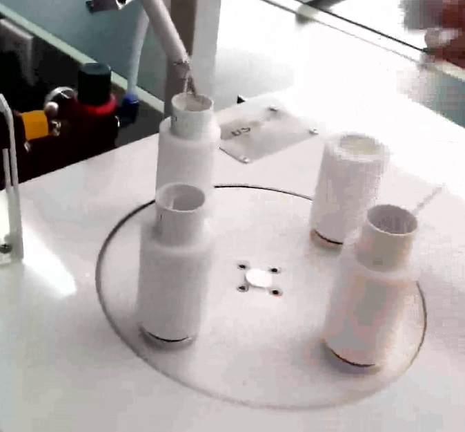 四個輪轉工位相隔90度角度,均勻分布在公轉圓盤的圓周上,公轉電機每次旋轉90度角度,逐個將每個輪轉工位的產品帶進打膠工位,自轉電機通過齒輪齧合的方式帶動進入打膠工位的產品勻速旋轉,實現均勻塗膠。